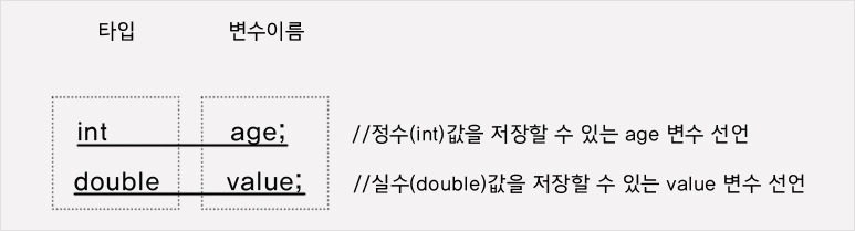 변수를 사용하기 위해선 먼저 변수를 선언해야 한다. 변수 선언은 어떤 타입의 데이터를 저장할 것인지 그리고 변수 이름이 무엇인지를 결정한다.